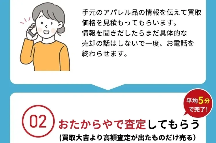 ご希望に合わせて、最短で即日のご訪問が可能。さらに査定料・送料・出張料などの手数料が無料!お問い合せから査定後のアフターフォローまで査定員がサポートしてくれるので安心です。