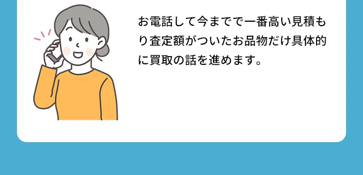 ご希望に合わせて、最短で即日のご訪問が可能。さらに査定料・送料・出張料などの手数料が無料!お問い合せから査定後のアフターフォローまで査定員がサポートしてくれるので安心です。