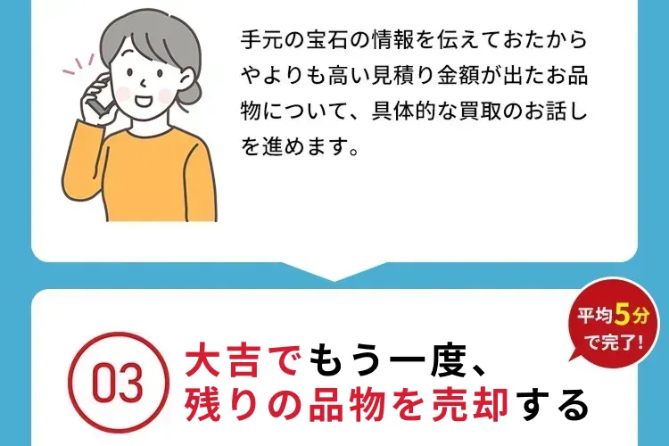 昔母が使っていたダイヤモンドの指輪がでてきたので大吉で見て頂きました。入りやすい綺麗な店舗ととても気さくなスタッフの方が対応してくださり安心しました。ダイヤモンドの説明なども詳しくしてくださり、何より想像より遥かに高い金額に驚きました。今度、叔母にも教えてあげようと思います。